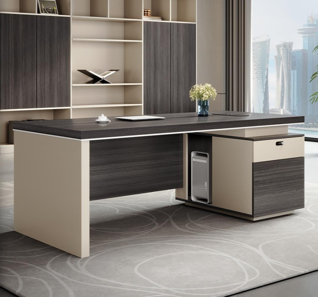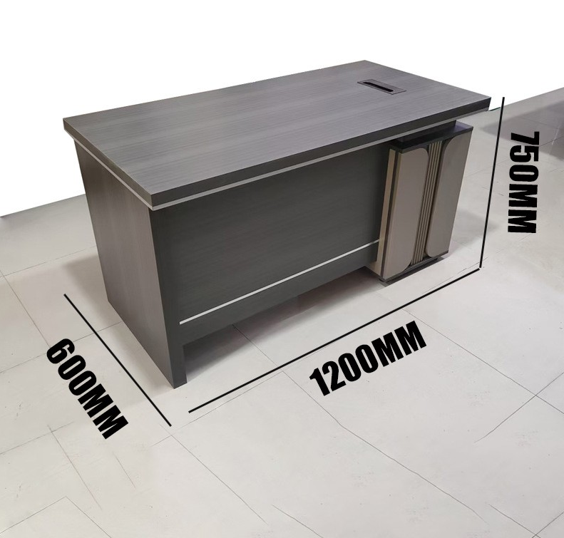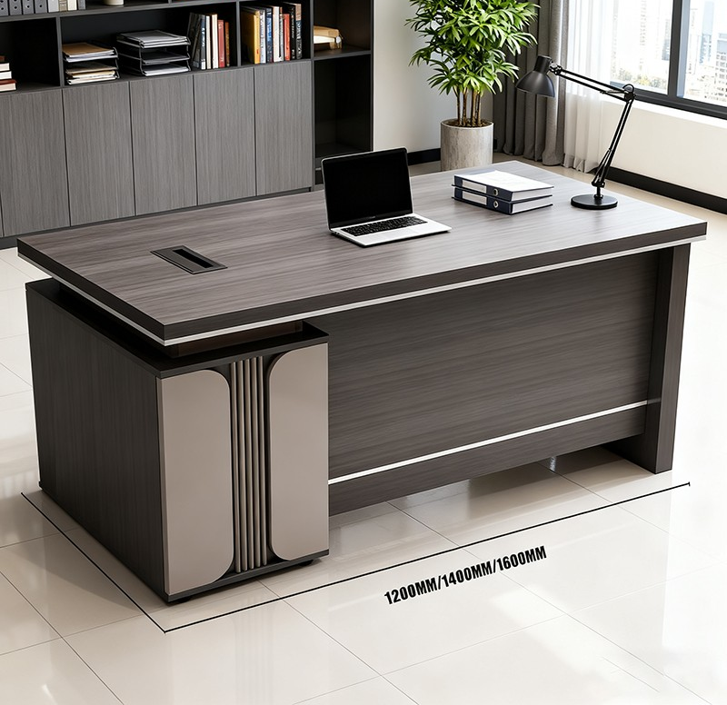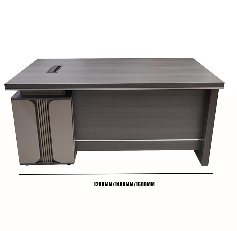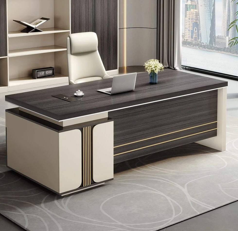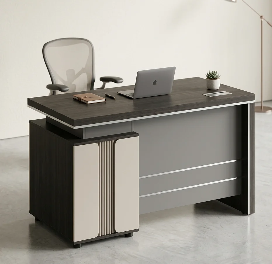 This desk is typically crafted from durable materials such as wood, laminate, or metal, often featuring a combination of textures and finishes that complement modern office aesthetics.
