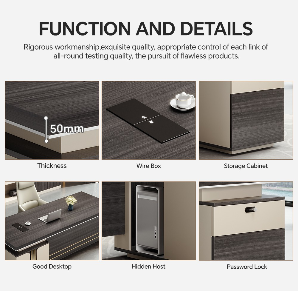 The desk features a practical layout that supports efficient workflow. It includes well-designed storage options such as drawers or compartments, allowing you to keep essential items within easy reach while maintaining a clutter-free workspace. This thoughtful design helps improve organization and creates a more professional working environment.