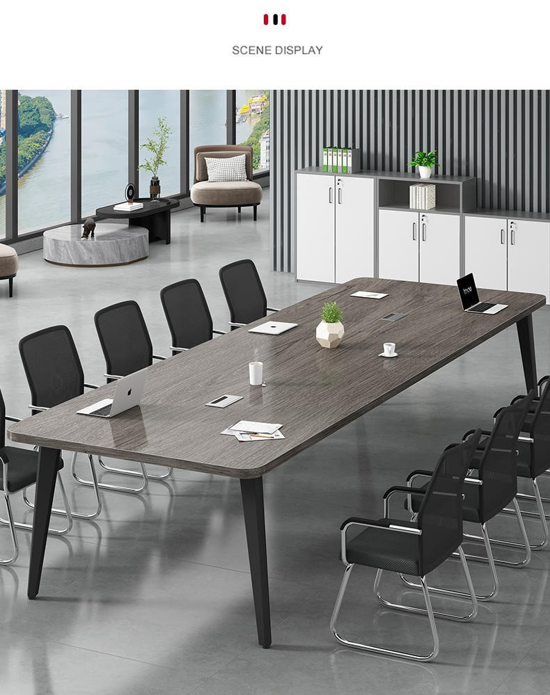 The 2.4 M Wooden Office Boardroom Table features clean lines, a neutral gray finish, and a contemporary silhouette. It complements modern, industrial, and minimalist office interiors. Moreover, the table enhances the professional look of any boardroom, creating a sophisticated impression for clients, employees, and visitors.