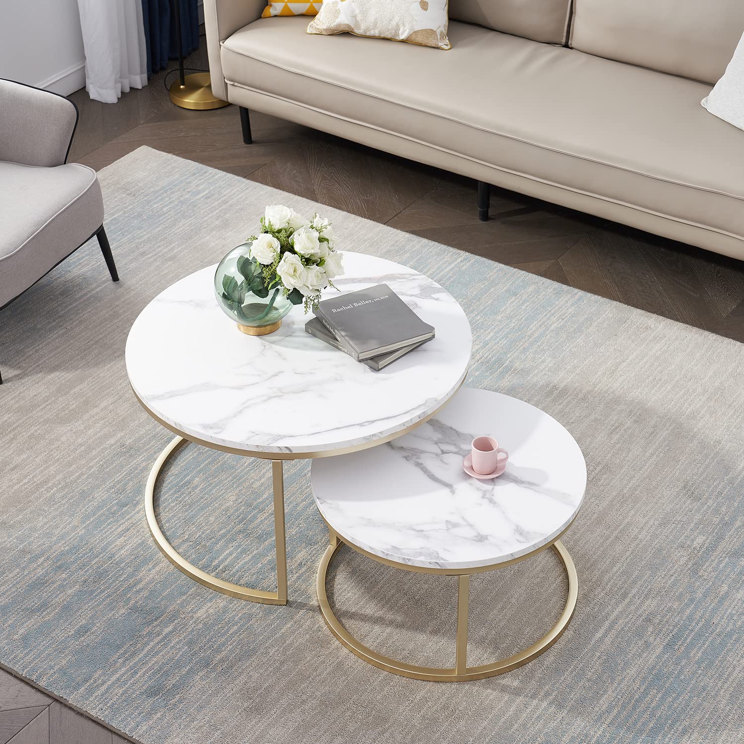 The set includes two tables in different sizes for versatile arrangements. You can nest them together for a layered effect or place them separately across your room. These tables combine beauty and practicality. The smooth marble surface is visually striking and highly durable, ideal for daily use. Use them to serve drinks, snacks, or display décor, books, or candles with ease.