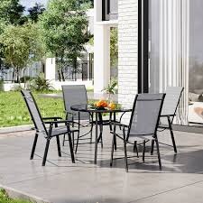 We craft this outdoor dining set from high-quality, weather-resistant materials to withstand the elements. The round table has a sturdy frame and a smooth surface that provides plenty of space for meals, drinks, or decor. Its classic round design invites conversation and creates a warm, welcoming atmosphere. The four matching chairs feature ergonomic designs that offer maximum comfort and support, letting you relax for hours.