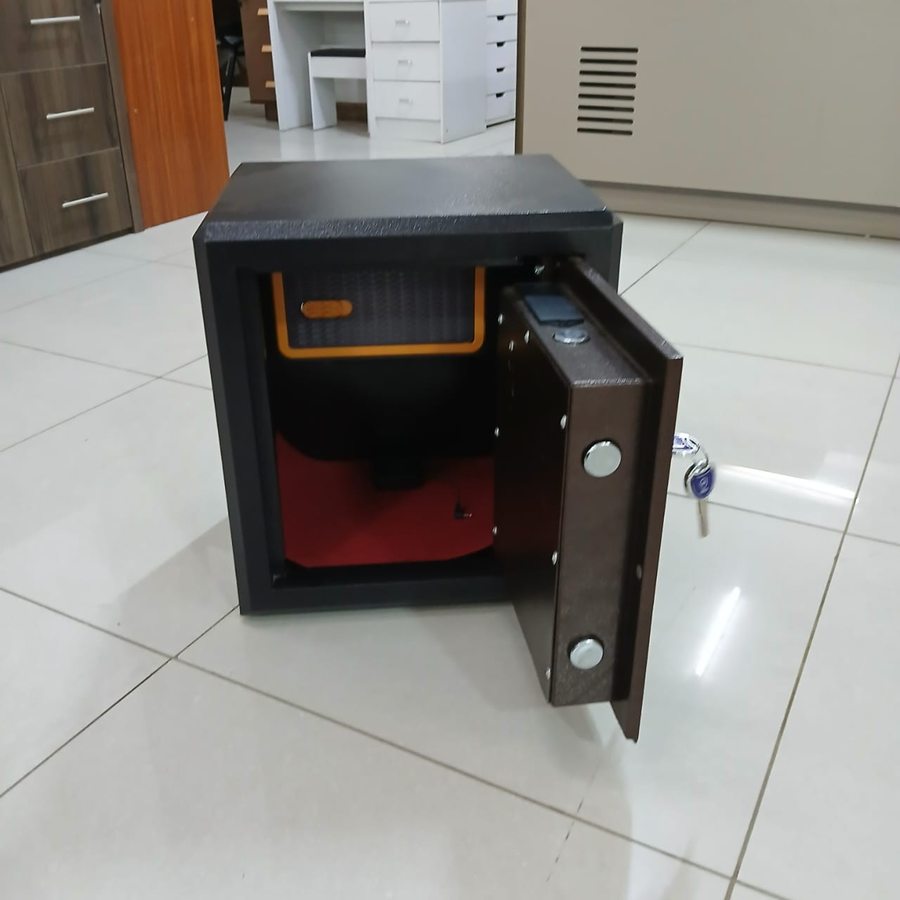 Designed to complement modern office interiors, this safe cabinet features a clean, professional look. The powder-coated finish resists scratches, stains, and corrosion, ensuring a polished appearance even with daily use. Available in neutral colors such as grey, black, and beige, it blends seamlessly with any office décor while enhancing professionalism.