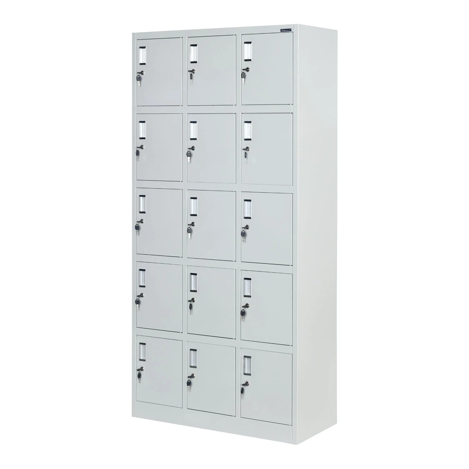 This office cabinet features 15 individual locker compartments, each equipped with a secure locking system. Whether using key locks, combination locks, or padlocks (depending on the model), each locker ensures the safety of personal belongings and sensitive items. This design is ideal for workplaces, educational institutions, gyms, or any facility that requires secure, private storage.