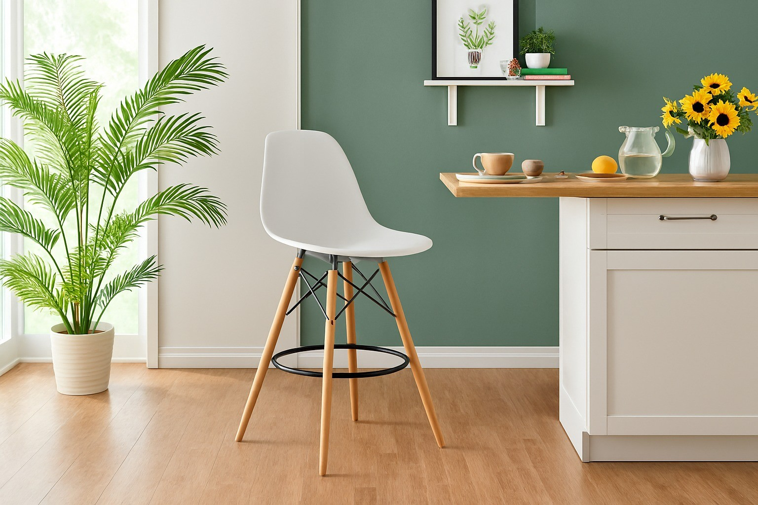 Designed with user comfort in mind, the Eames counter chair features a molded plastic seat that gently contours to the body. This ergonomic shape provides reliable support for the back and hips, even during extended sitting periods. Therefore, it is ideal for casual dining, counter seating, collaborative office spaces, and social areas. The smooth, curved seat edges reduce pressure points, while the well-balanced height ensures comfortable seating at standard counter levels.