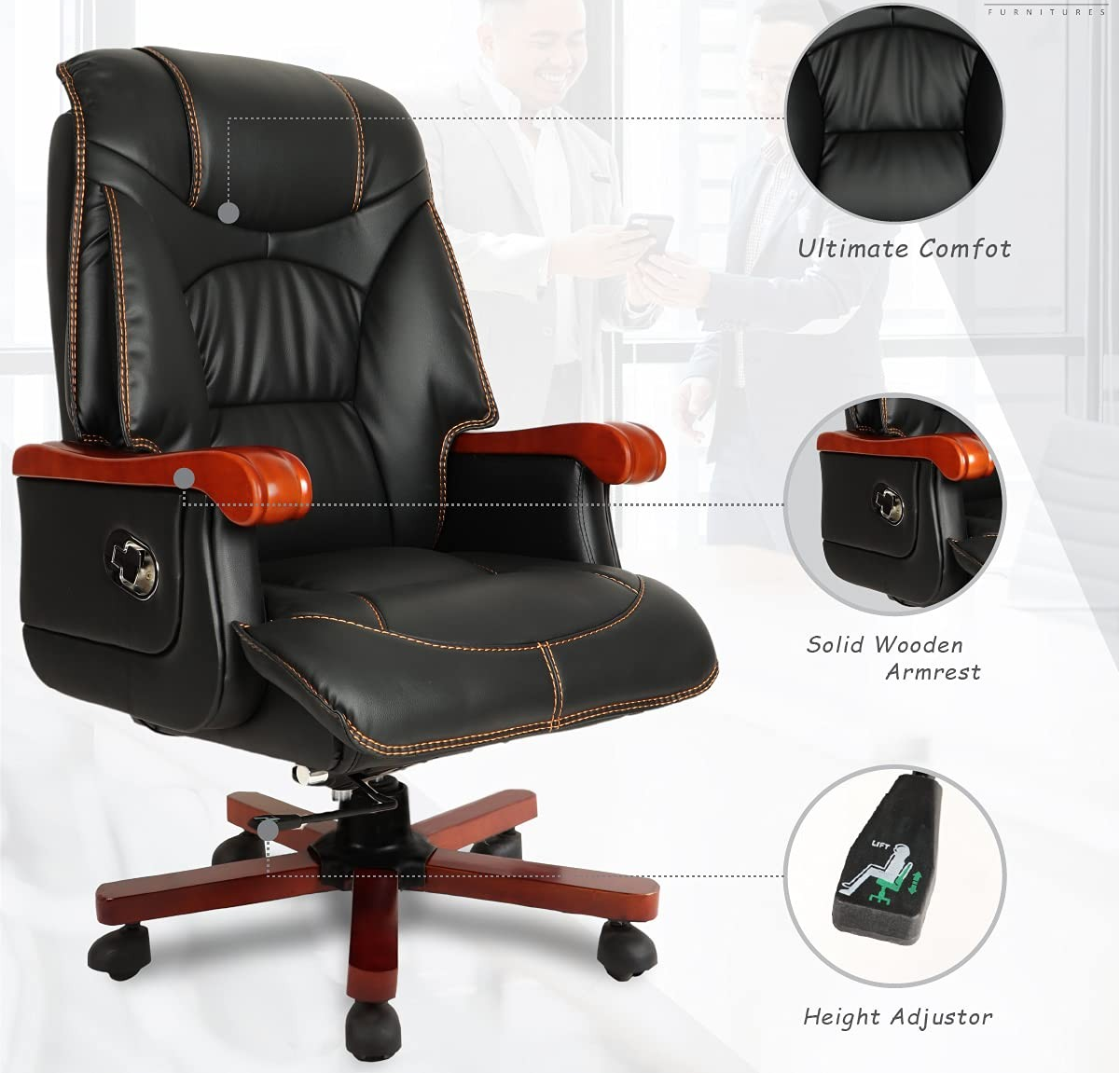 Experience a new level of comfort and sophistication with our Wooden Frame Reclining Office Chair, designed to enhance productivity while adding a touch of timeless elegance to your workspace. Crafted with a premium solid wood frame and upholstered in high-quality leatherette or genuine leather, this chair combines classic craftsmanship with modern ergonomics. Its smooth reclining mechanism allows you to adjust the backrest angle effortlessly, ensuring personalized comfort during long working hours, meetings, or reading sessions. The plush high-density foam padding offers superior support, reducing fatigue and promoting proper posture throughout the day.